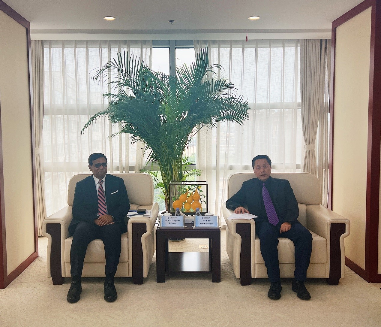 王承杰秘书长对K.A.M. Majedur Rahman先生来访表示热烈欢迎,并回顾了机构间近年来的合作情况。他表示,两机构长期保持友好关系,双方于2021年签署合作协议,先后通过人员互访、仲裁员互荐等方式开展了卓有成效的交流。随着“一带一路”倡议的深入实施,中国与南亚地区经贸往来日益频繁,当事人对高质量争议解决服务的需求不断提升。贸仲持续优化服务、积极拓展国际合作,机构公信力和国际影响力不断增强。同时,贸仲近年来着力推进数字化建设,通过打造智慧仲裁平台和集成化官网,更好地满足数字时代的争议解决需求。王承杰秘书长表示,作为中孟两国具有代表性的仲裁机构,贸仲与孟加拉国际仲裁中心应进一步深化合作,共同为两国乃至南亚地区当事人提供更加优质的争议解决服务,推动区域经贸合作与发展。