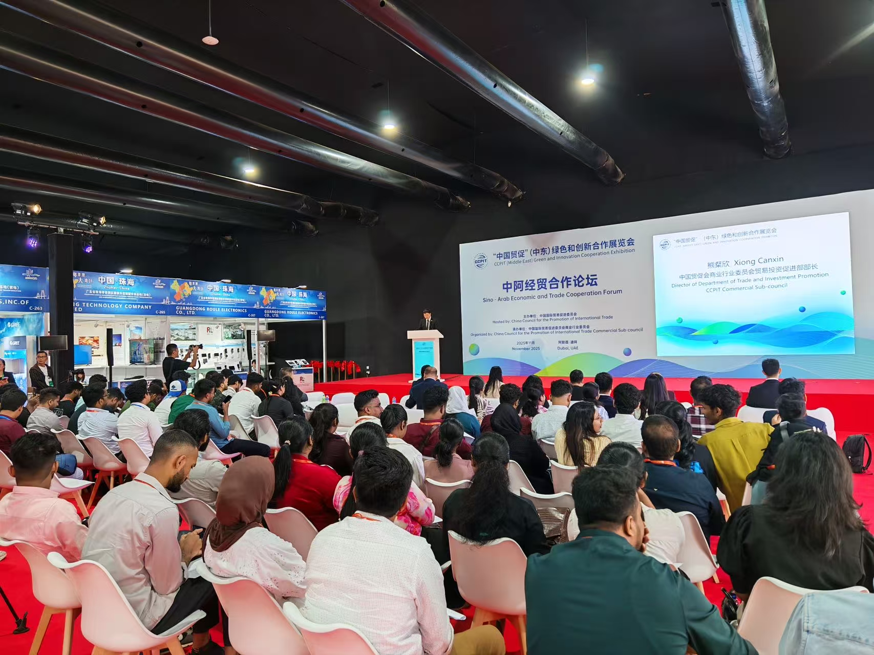 11月26日,“中国贸促”(中东)绿色和创新合作展览会在阿联酋迪拜节日城展览中心成功开幕。本次展会由中国贸促会主办,展期三天,展览面积约1000平方米,共有38家中国企业参展,展品涉及人工智能、机械设备、新能源汽车与配件、医疗用品、家电及电子产品、高端消费品、创意产品等领域。展会得到中阿各界高度重视,中国驻迪拜总领馆总领事欧渤芊、阿联酋外贸部副部长法赫德·卡尔卡维、中国贸促会驻海湾地区代表处首席代表赵丽艳、中国机电商会副会长刘春等出席同期活动并巡馆。